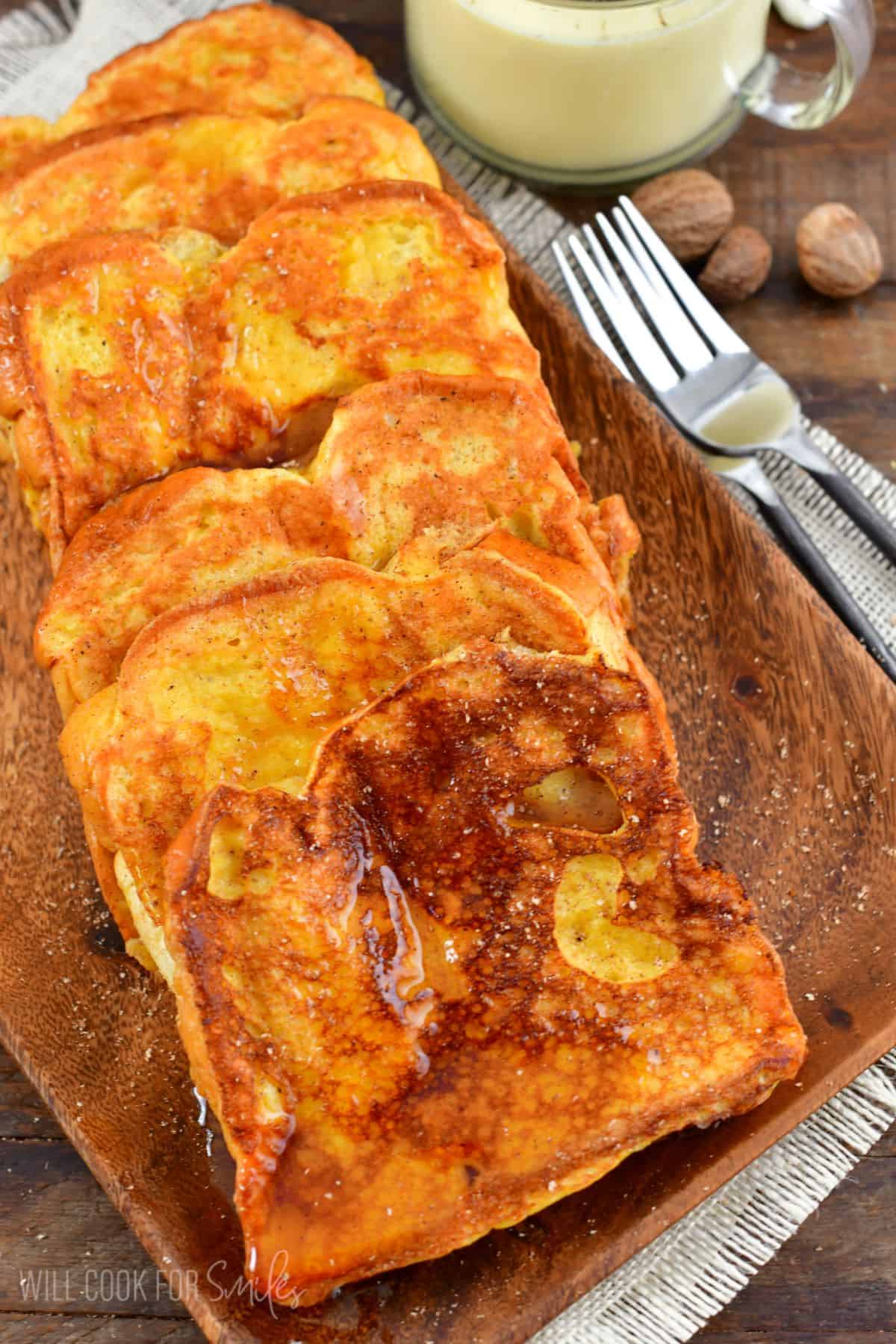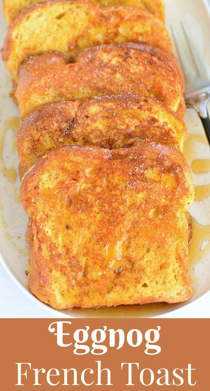 It’s my husband’s favorite time of the year when I bring home eggnog. He lights up in anticipation of cocktails, cookies, and breakfast treats that I make using eggnog. Eggnog Pancakes is his favorite holiday breakfast, but I prefer this eggnog French toast!
