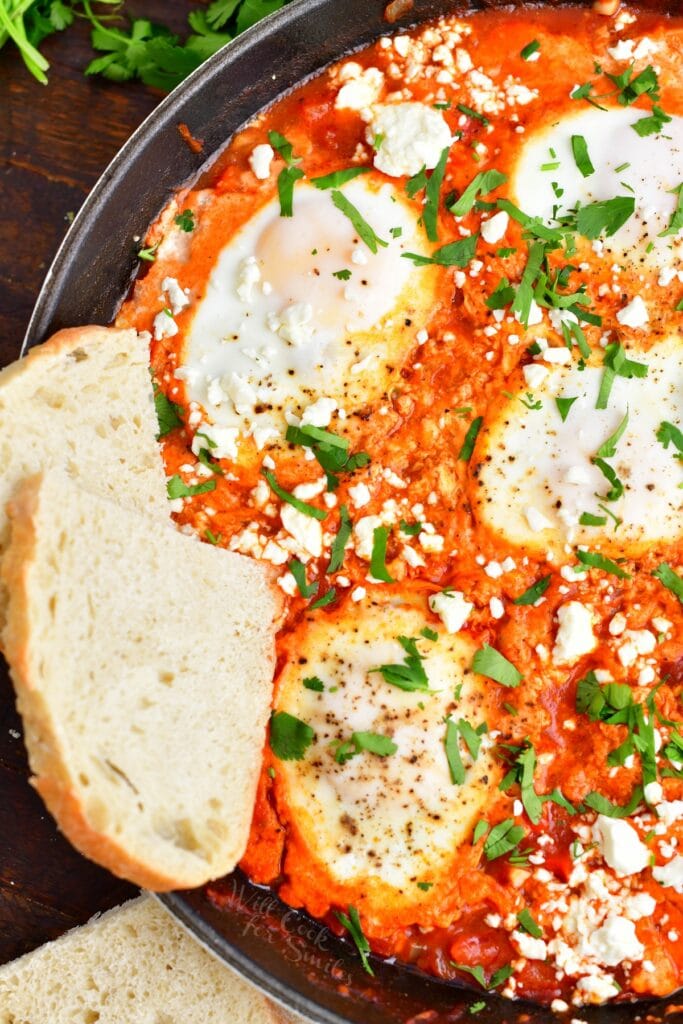 - Also, I love to sprinkle crumbled feta cheese on top of the shakshuka just before serving. It’s deliciously complimentary to the tomatoes and eggs.